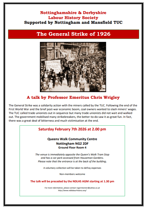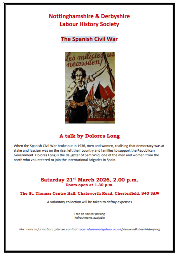 In 2026 we are planning events around the centenary anniversary of the General Strike, including a talk from eminent labour historian, Chris Wrigley. On 28th March 2026, at St Thomas’s Church Hall, Chatsworth Road, Chesterfield, we have a Dolores Long speaking on the Spanish civil war.