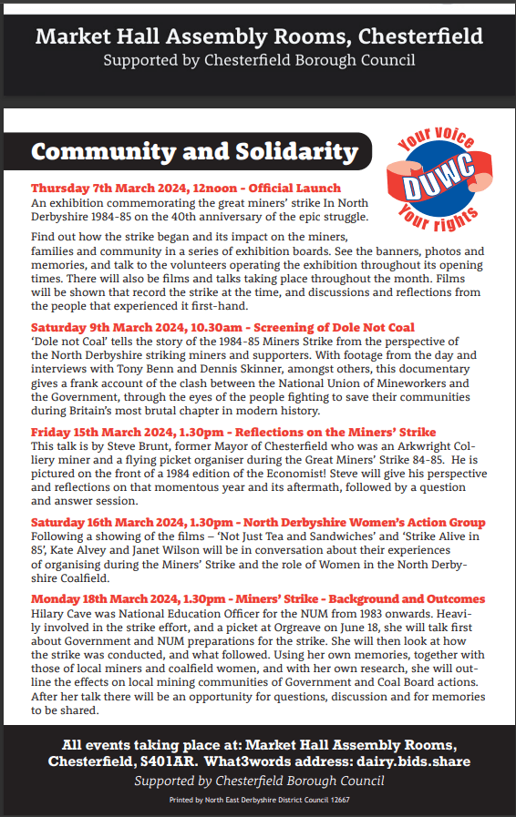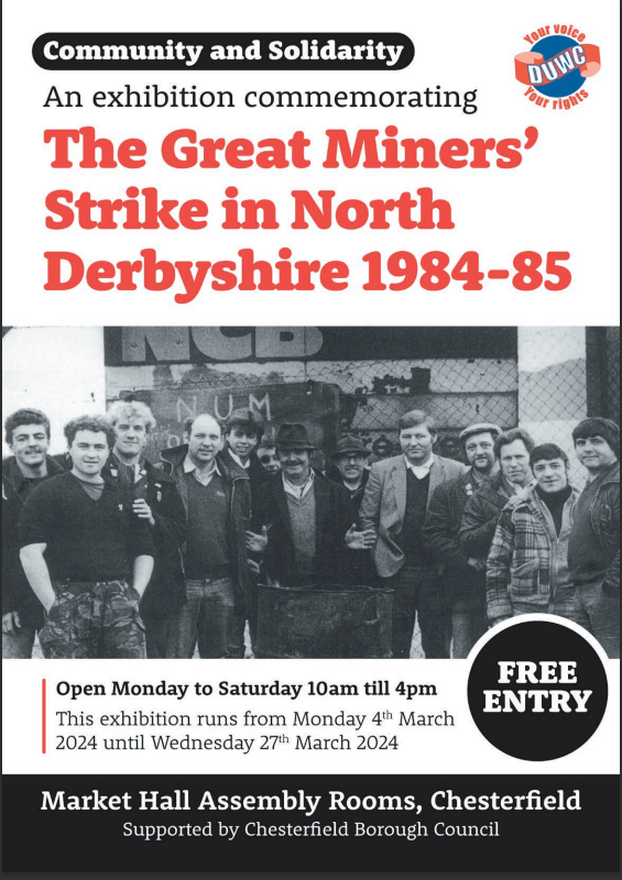 An exhibition called Community and Solidarity, commemorating the strike in North Derbyshire, will run from 4 March until 27 March, Monday to Saturday 10 until 4, in the Market Hall Assembly Rooms (above the Market Hall) Chesterfield S40 1AR. Several events will take place during that time. Free entry.